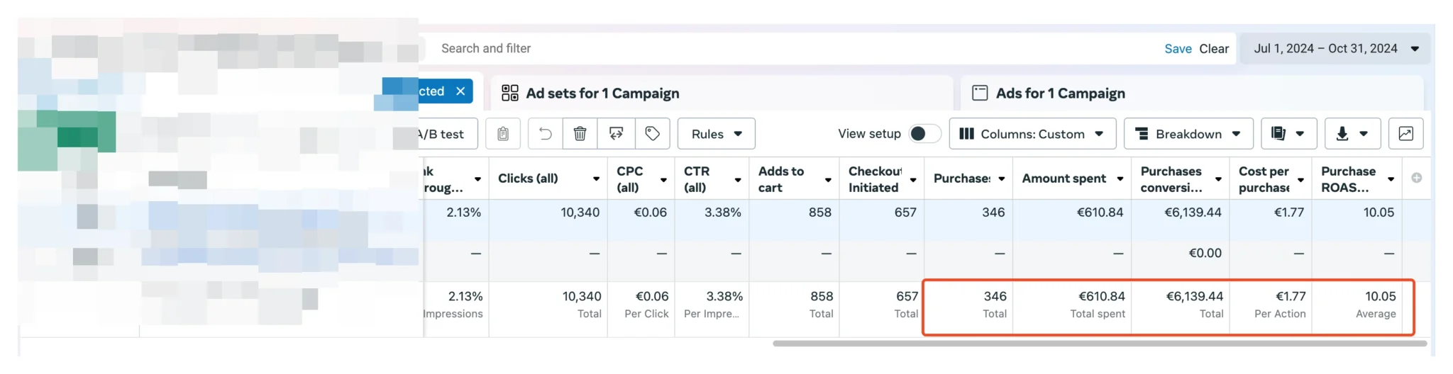 Over the four-month period from July to October 2024, the campaign achieved exceptional results. With a total ad spend of €610.84, the ads generated over 100,000 impressions and 10,340 clicks, resulting in a click-through rate (CTR) of 2.13%. The average cost per click (CPC) was just €0.06, reflecting the cost-effectiveness of the campaign.