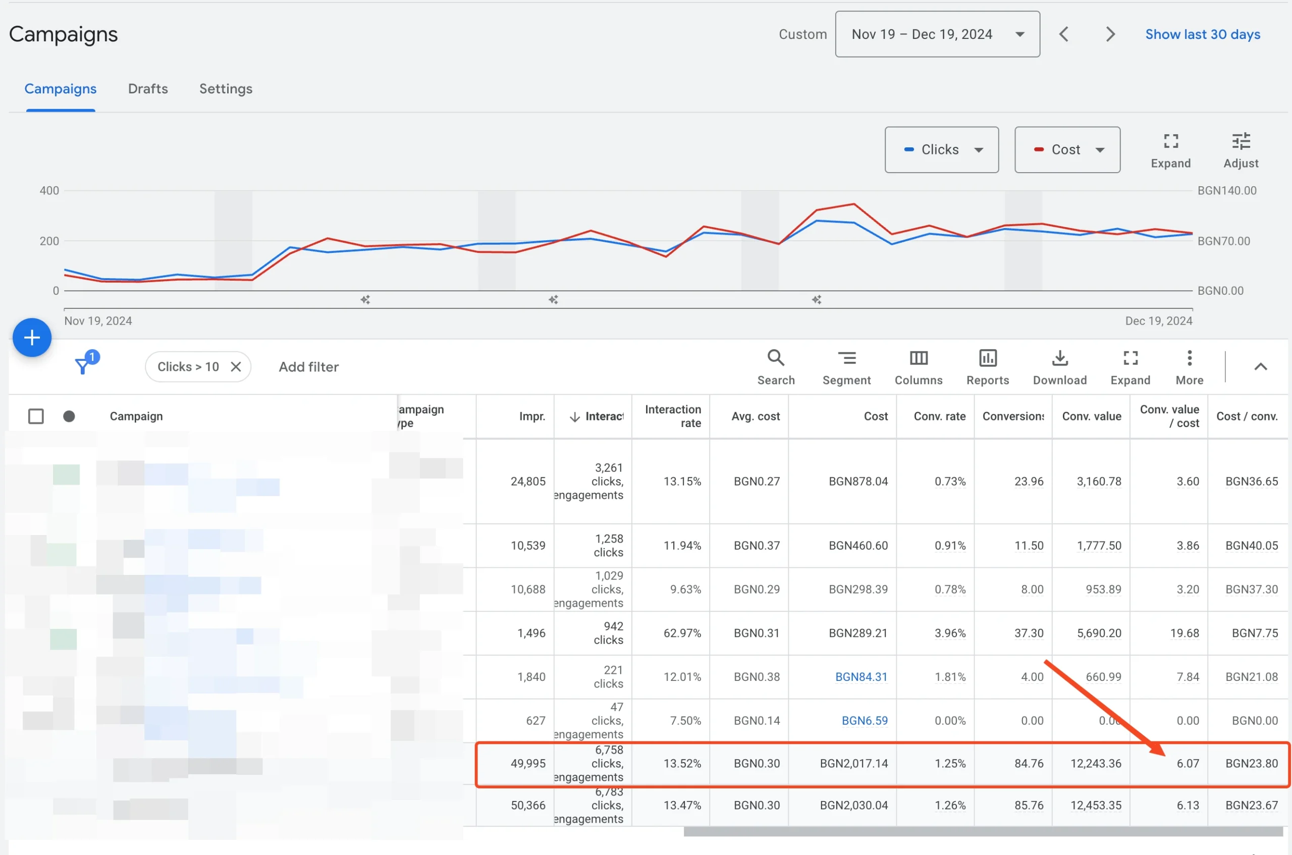 Between October and December 2024, the campaigns showed significant improvements. The interaction rate increased from 7.13% to 13.52%, indicating a higher level of engagement with the ads. The conversion rate improved from 0.56% to 1.25%, nearly doubling the efficiency of converting clicks into sales. The cost per conversion dropped from 59.33 BGN to 23.80 BGN, making conversions far more cost-effective. Additionally, the ROAS increased from 2.54 to 6.07, reflecting much stronger returns on ad spend. Finally, the conversion value grew from 6,063.24 BGN to 12,243.36 BGN, nearly doubling the revenue generated.