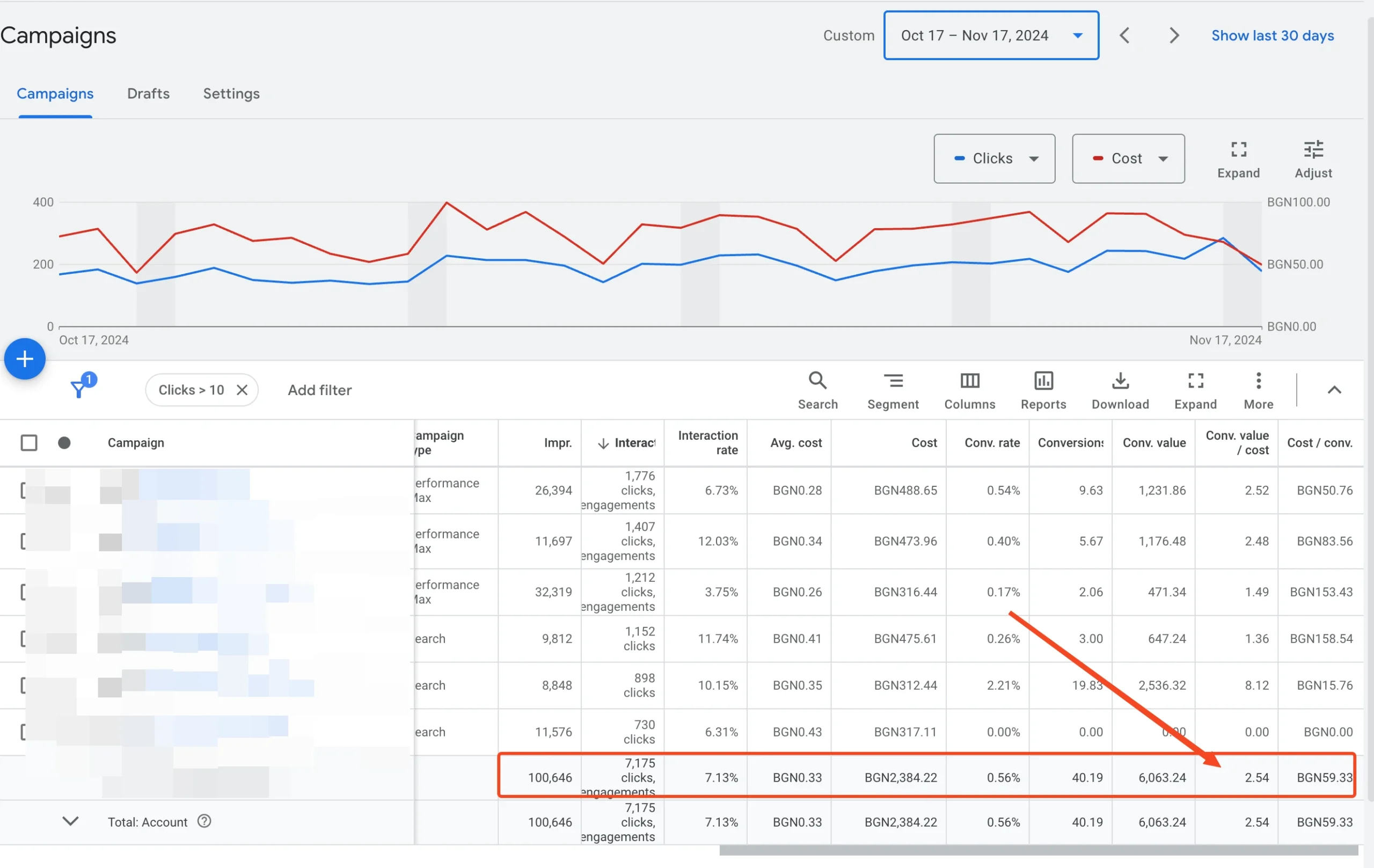 In October 2024, the client’s ad spend was approximately 2,384.22 BGN, generating 100,646 impressions with a 7.13% interaction rate and an average CPC of 0.33 BGN. The conversion rate was low at 0.56%, delivering a conversion value of 6,063.24 BGN, but the cost per conversion was disproportionately high at 59.33 BGN. This resulted in an ROAS of 2.54, leaving significant room for improvement.