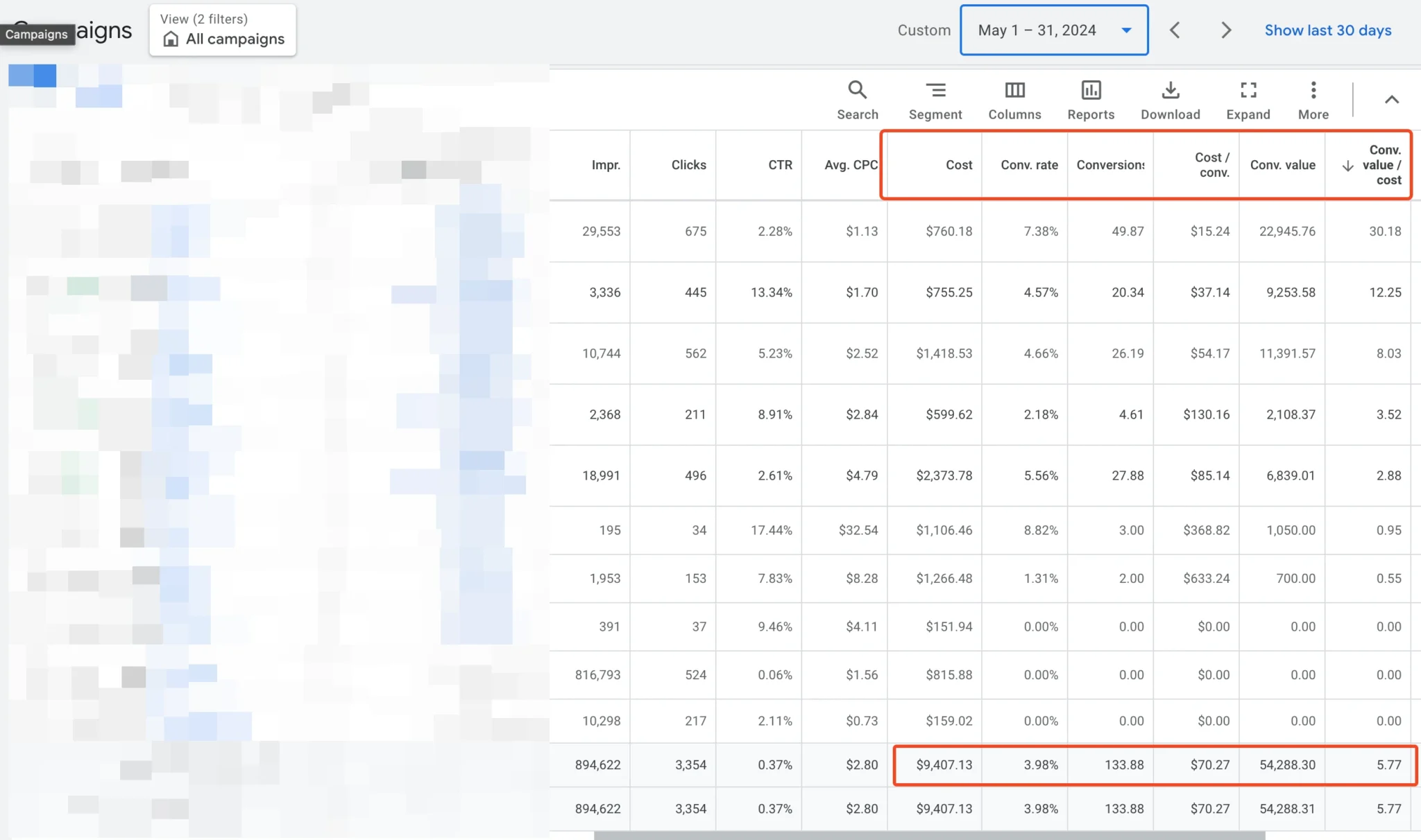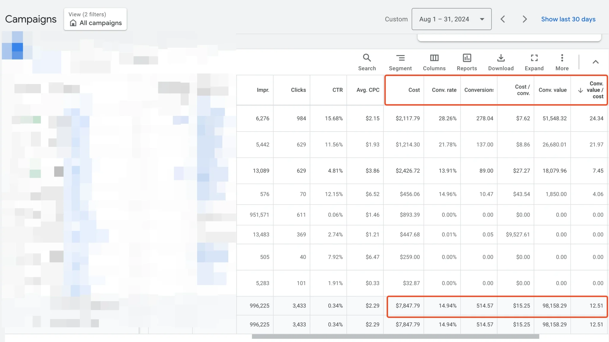 The conversion rate increased significantly to 14.94%, resulting in 514.57 conversions. The cost per conversion dropped substantially to $15.25, reflecting improved efficiency in driving valuable actions. Overall, the campaigns generated $98,158.29 in revenue, achieving an impressive return on ad spend (ROAS) of 12.51.